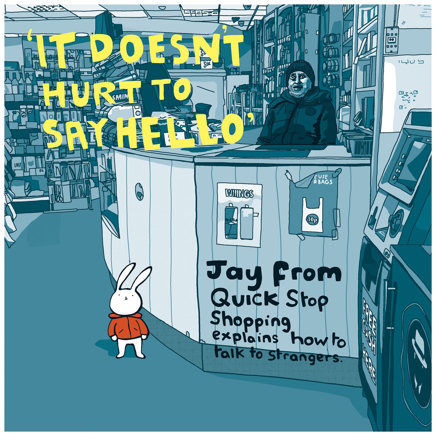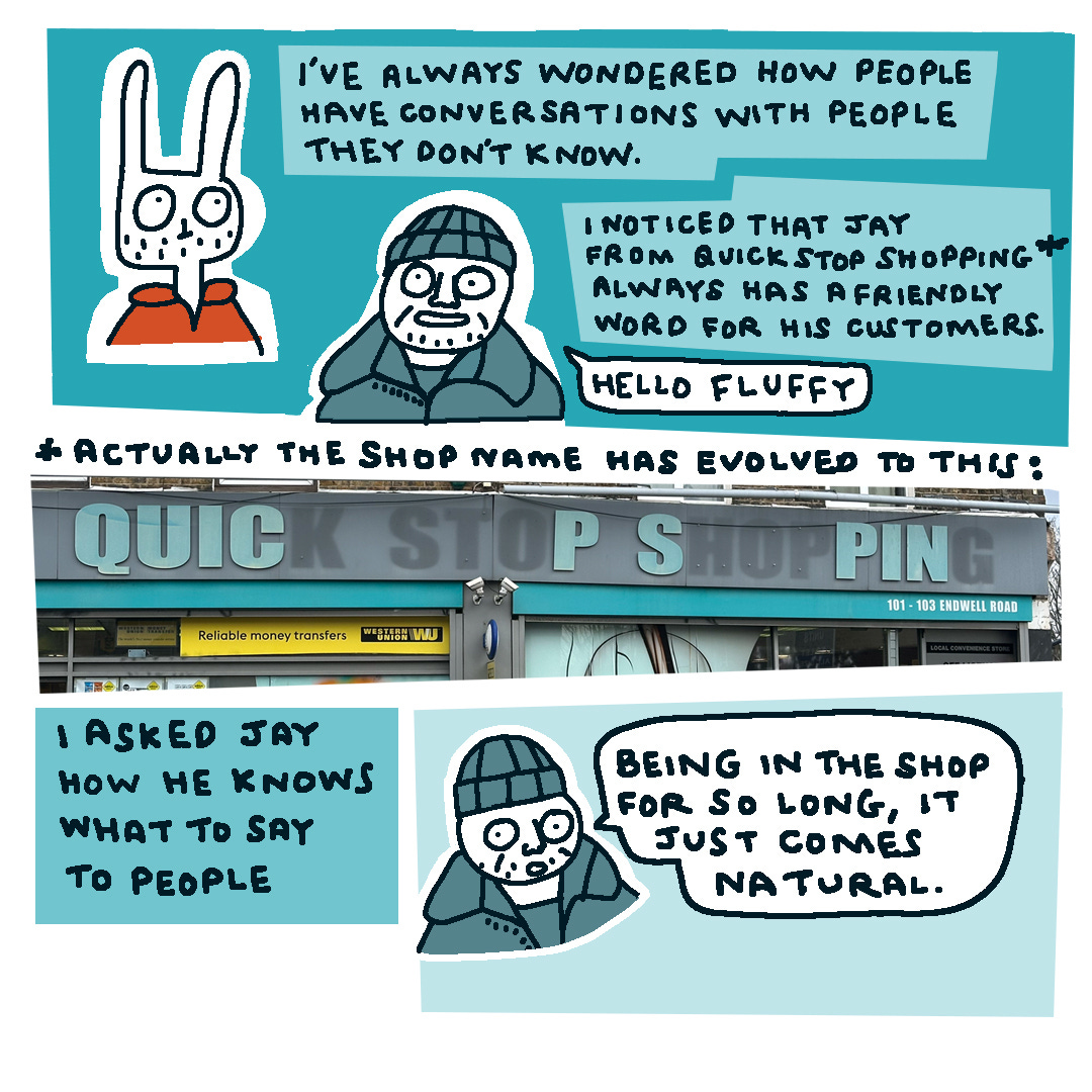 This is Fluffy’s latest write up on Instagram where he asks Jay from the corner shop how he knows what to say to people he doesn’t know.