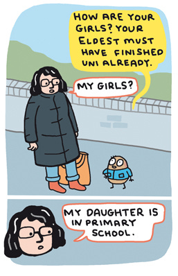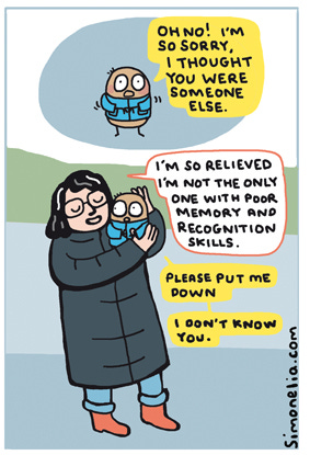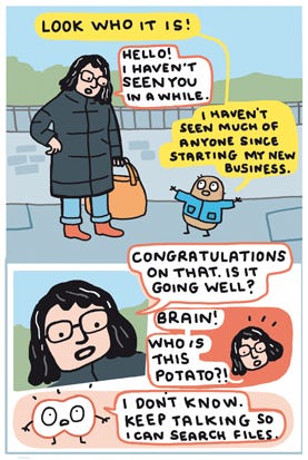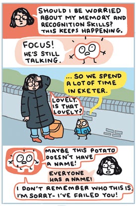 I’ve had similar scenarios twice since drawing this comic, disappointingly not with potatoes but only this morning I could see the mini panic in someones face trying to work out who I was when I was talking to them. So I stopped to say my name and the context that we knew each other. Maybe that could become a thing, that would be handy.